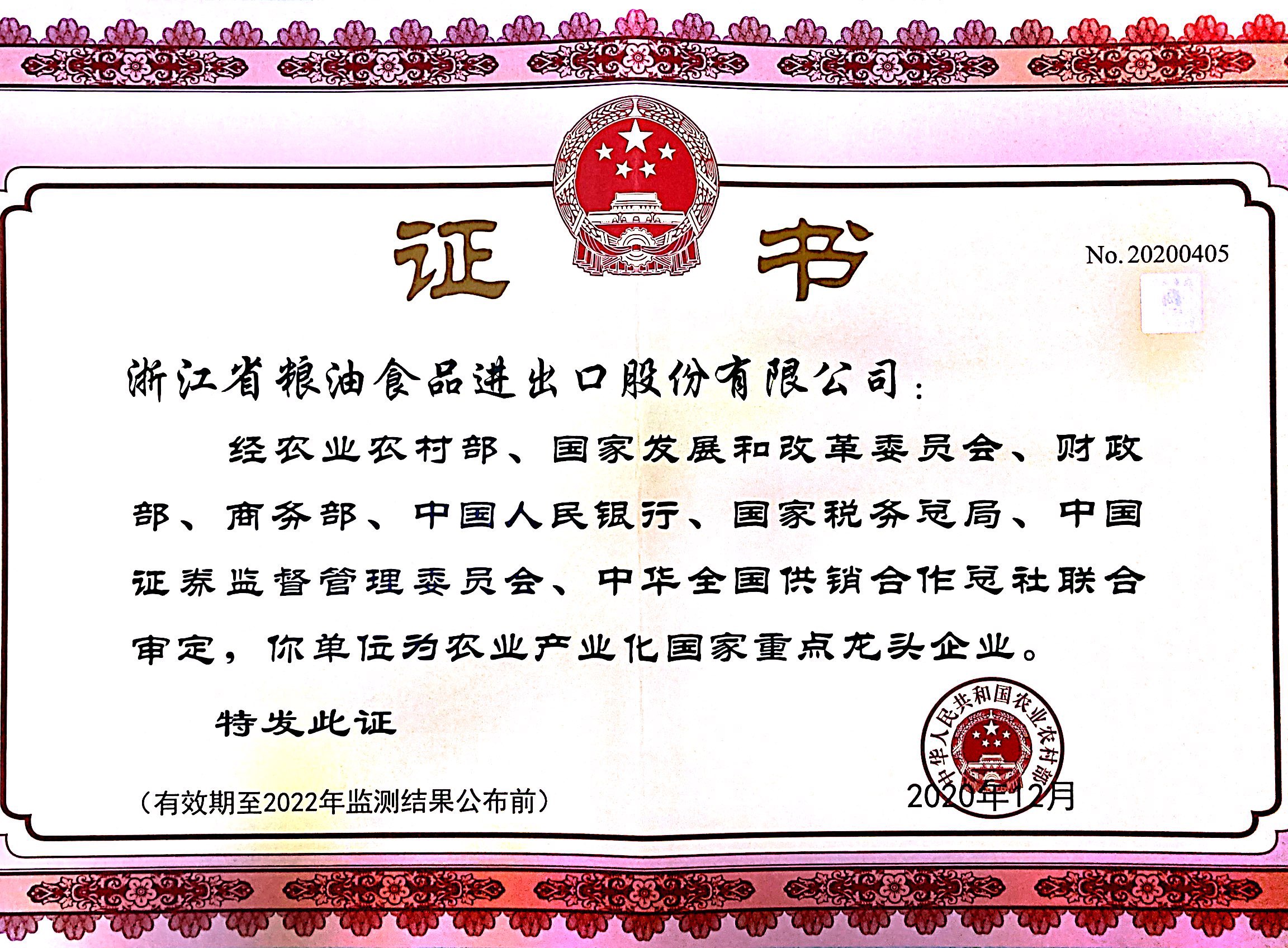 公司與寧波天韻公司通過第九次農(nóng)業(yè)產(chǎn)業(yè)化國家重點(diǎn)龍頭企業(yè)監(jiān)測復(fù)評(píng)